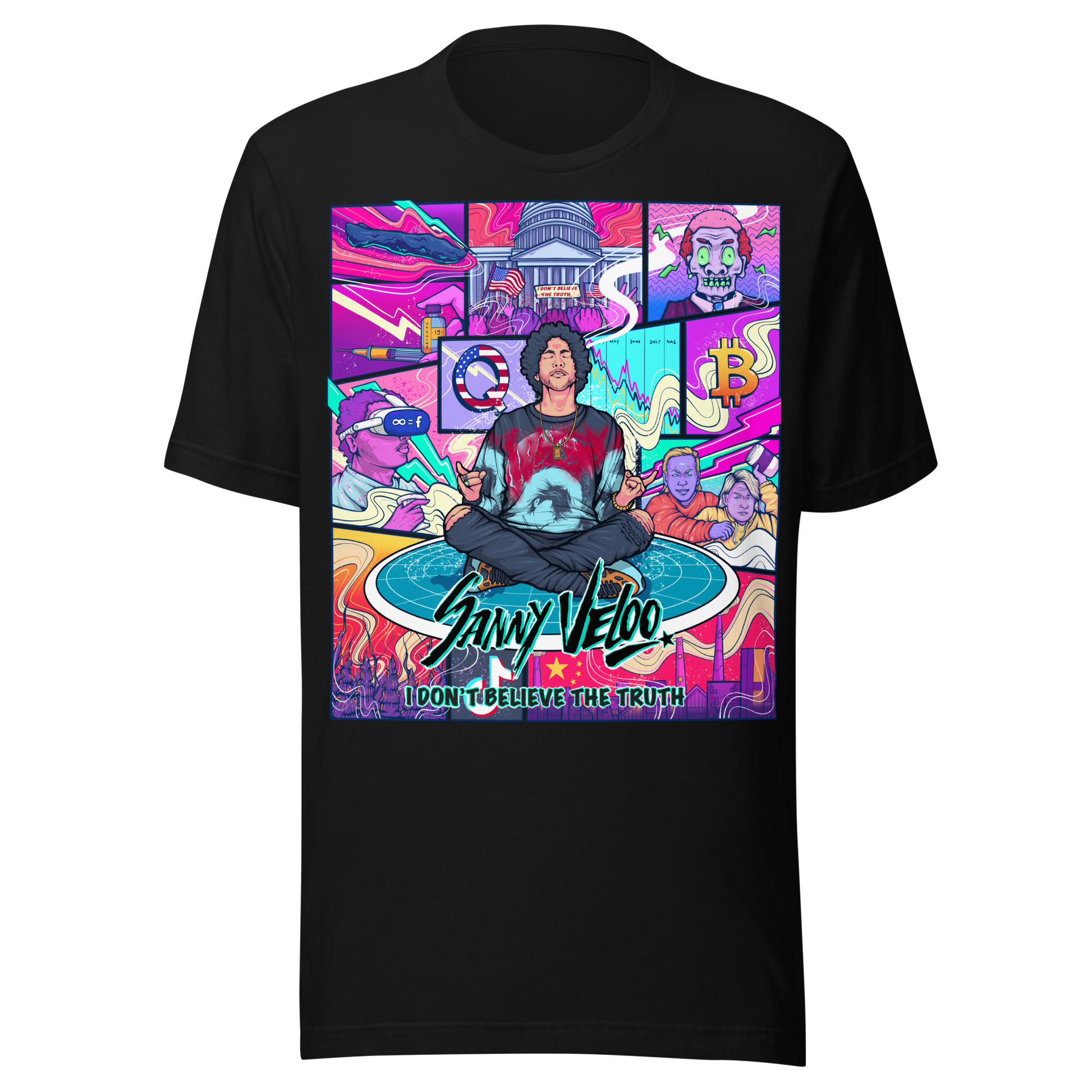 This ain’t just a t-shirt. It’s a technicolor meltdown of truth bombs, crypto bros, brainwashed scroll zombies, and a zen Sanny levitating above the madness. Inspired by the alt-rock anthem I Don’t Believe The Truth, this limited-edition shirt is your official uniform for questioning reality — or at least looking cool while the world burns 🔥🧘🏽♂️📉
